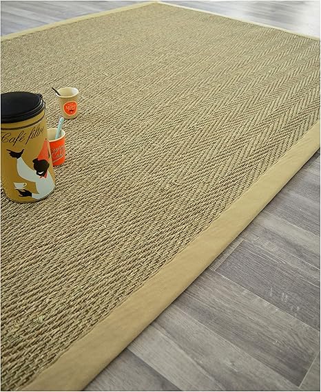 Decoweb Tapis Jonc De Mer Bihar Fin Chevron Ganse Coton Beige