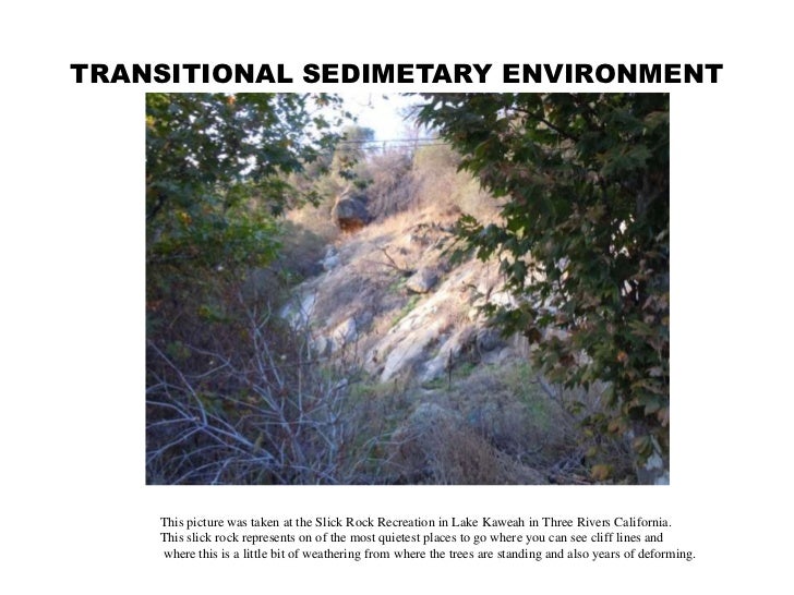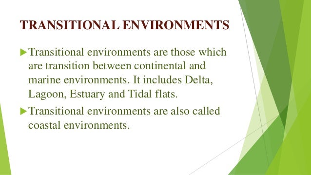 Supratidal zone the zone is influenced by extreme tides. Transitional environments transitional environments are those which are transition between continental and marine environments. Intertidal zone located on between high and low tide level. The table below includes specific environments where various types of sediments are deposited and common rocks structures and fossils that aid in deducing the depositional environment from examining a sedimentary rock outcrop.